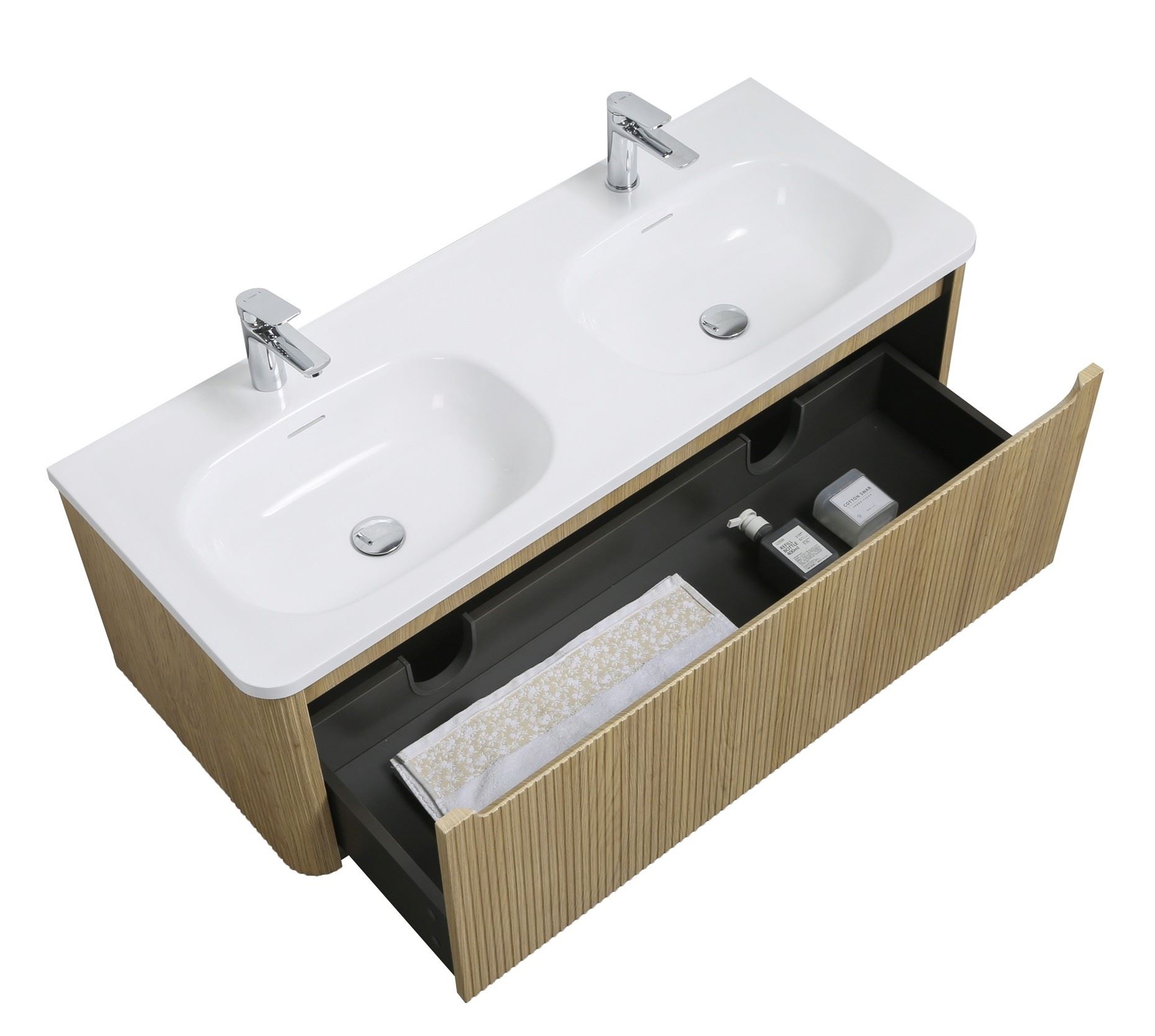 Azzaro OAK finish double bathroom cabinet 1200 x 480 x 425 H with 1 drawer, Fluted design all around, FREE delivery to JHB/ PRETORIA
